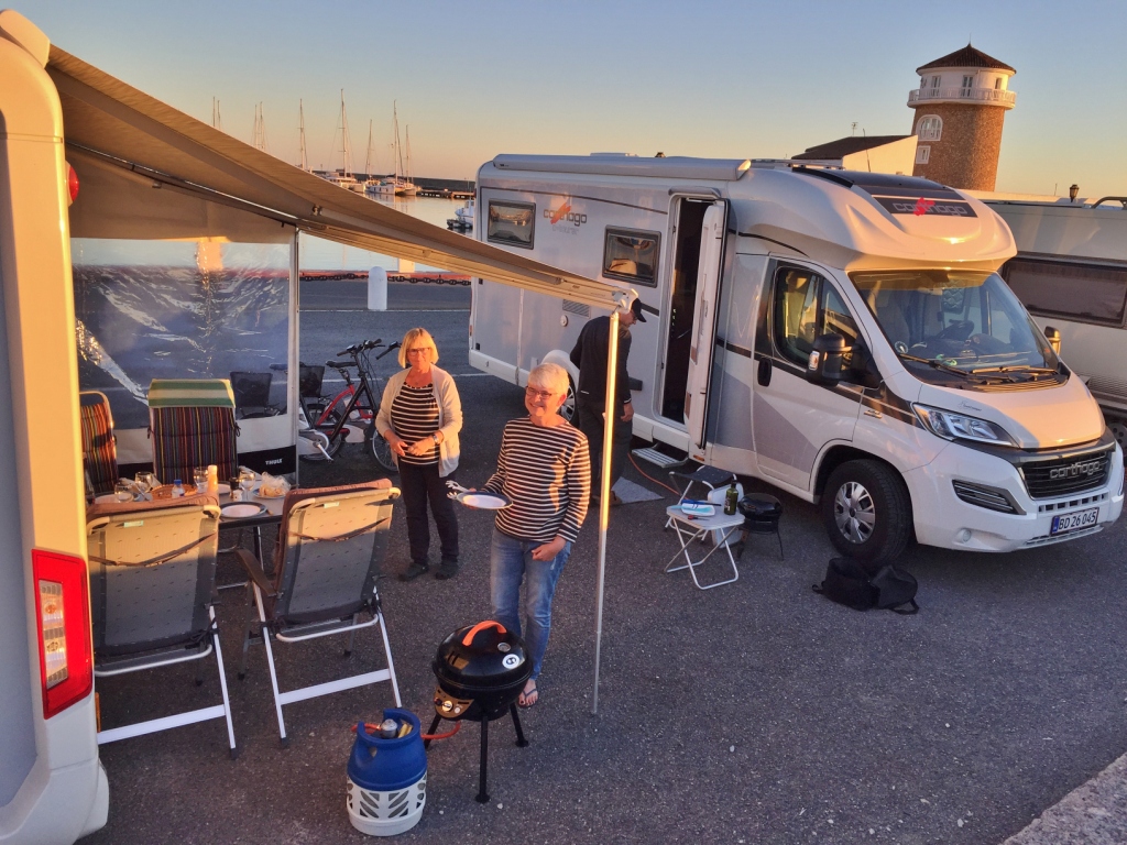 Hen på eftermiddagen trækker det op til regn, og vi søger ly under markisen, monterer et sidestykke i vindsiden og sætter stormbarduner på. Dejligt - vi griller og spiser ude på trods af regnen. Da vi har spist, blæser det voldsomt op, og det rusker vildt i markisen. Vi skynder os at rydde ind efter aftensmaden og Jens Erik og Svend Åge får hurtigt pakket grill og markise sammen igen. Vi går ind og hygger med et spil kort - Rosa og jeg skal have revanche i et nyt sjovt spil, som vores børn har introduceret os til, "Ligretto".